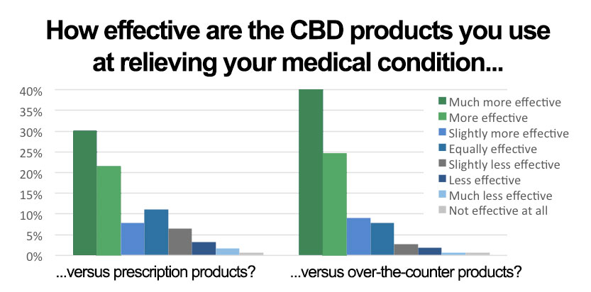 In fact, a recent survey revealed that 60% of users say CBD is “more effective” than prescription medications. 75% found CBD more effective than over-the-counter products, as you can see below: